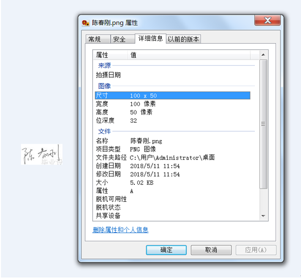 登录毕业论文管理系统,打开账号管理中的上传电子签名,鼠标右键点击电子签名图片保存于桌面。鼠标左键双击图片,在照片查看器中鼠标右键点击属性,如下图可见像素信息。连同电子签名截屏保存于word文档。发给教研室主任,对于不符合要求的电子签名,教研室主任提示老师重新制作并审核。