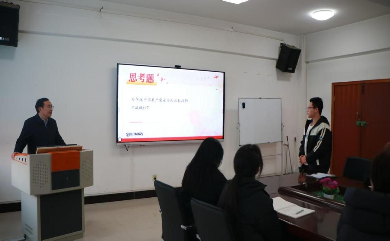 课堂上,刘全永以问题为导向引发学生深度思考,通过“为何说中国共产党是全民族抗战的中流砥柱?”“为何说抗日战争是中华民族由衰败走向复兴的重大转折?”等兼具历史深度与思想性的提问,瞬间点燃了现场气氛。同学们踊跃举手、积极作答,结合所学所思分享对红色历史的认知与抗战精神的理解,互动交流氛围浓厚。