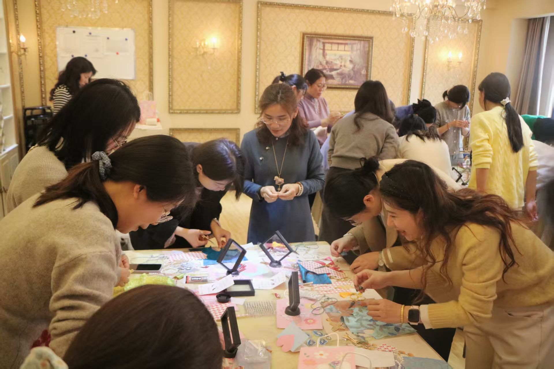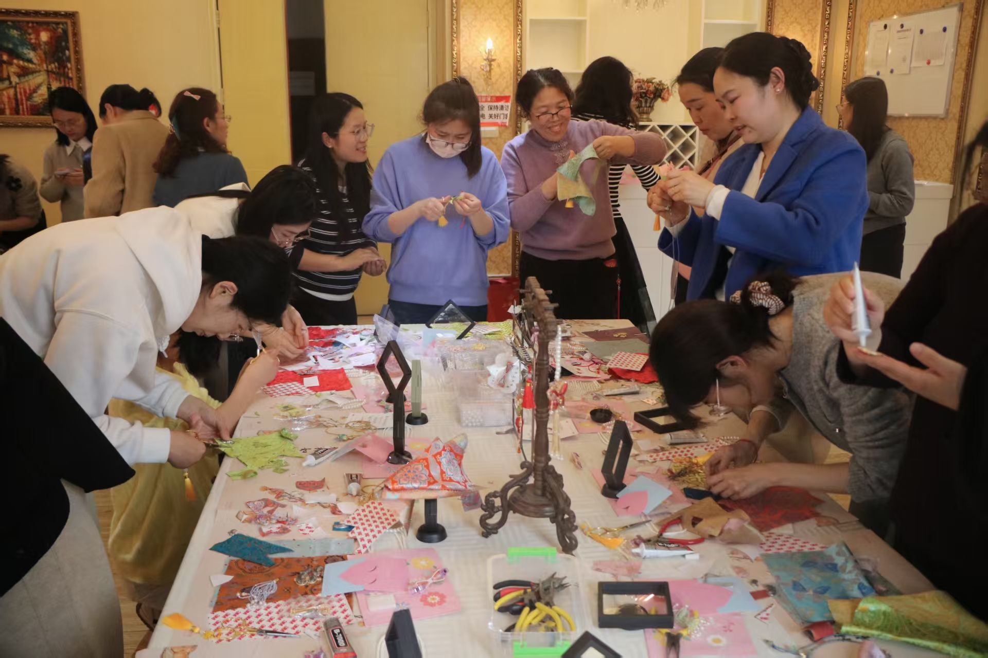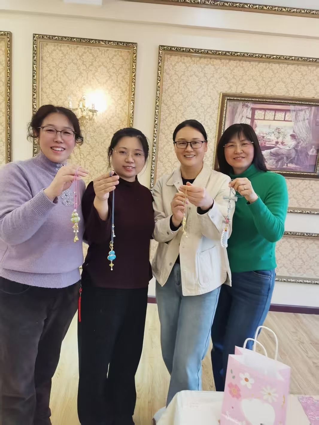 大家专注创作、相互交流,一件件精致的宋锦饰品陆续完成,不少老师当场将作品做成毛衣链佩戴,古韵与时尚兼具,尽显优雅风姿。此次活动既让女教职工放松身心,也让非遗文化在指尖焕新,获得老师们一致称赞。